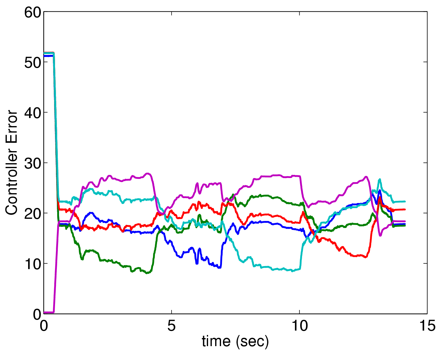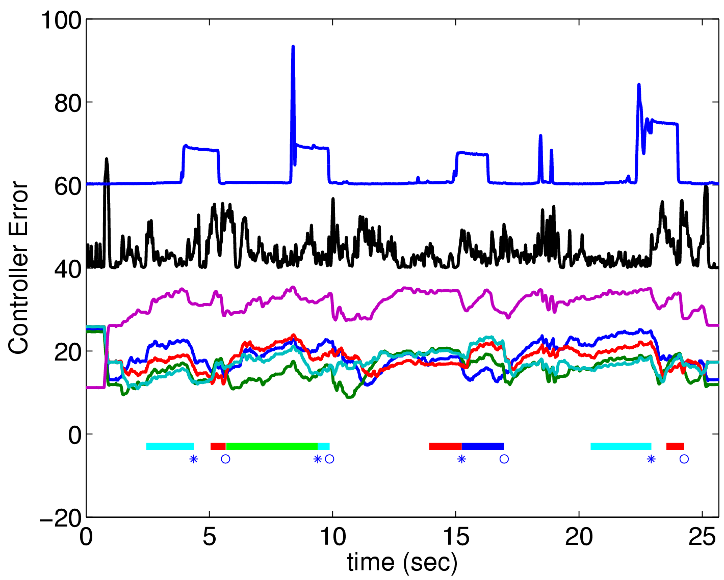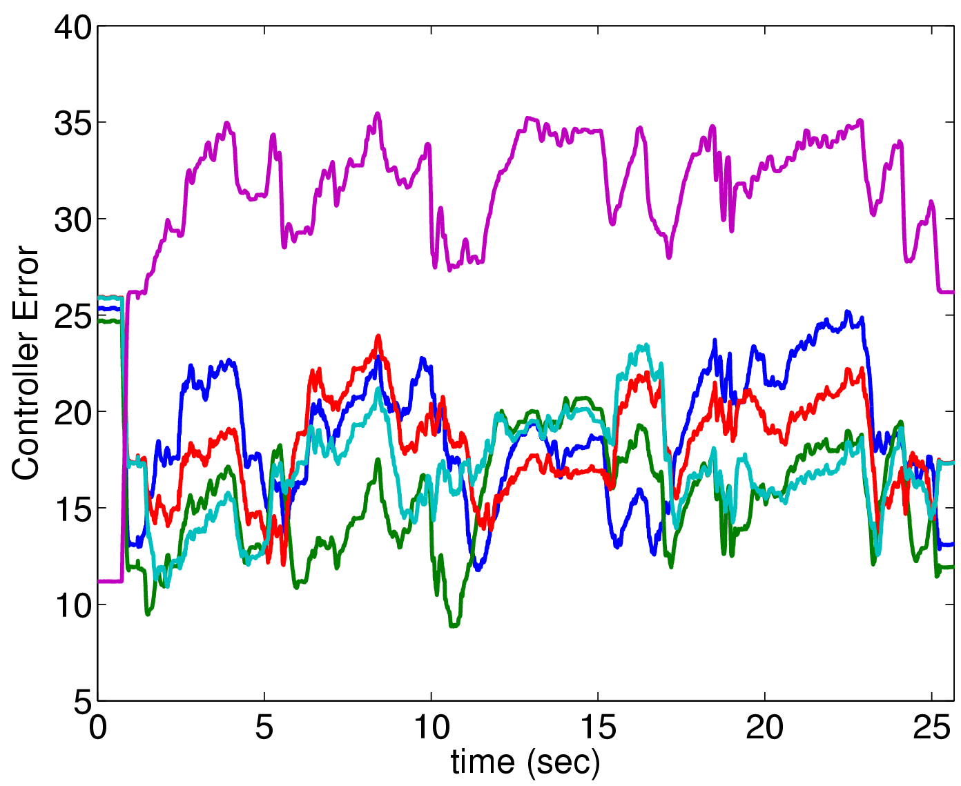 The errors for each controller as a function of time are shown below. Note that "good" is down. In this example, the sequence of four controllers is visible in the temporary drop in error for a single controller.