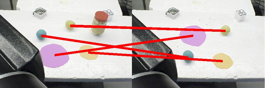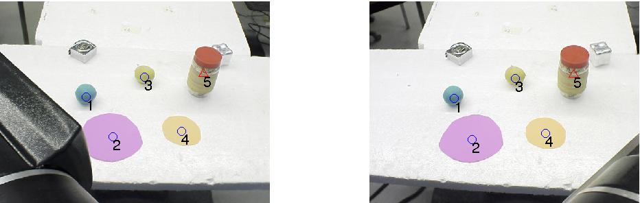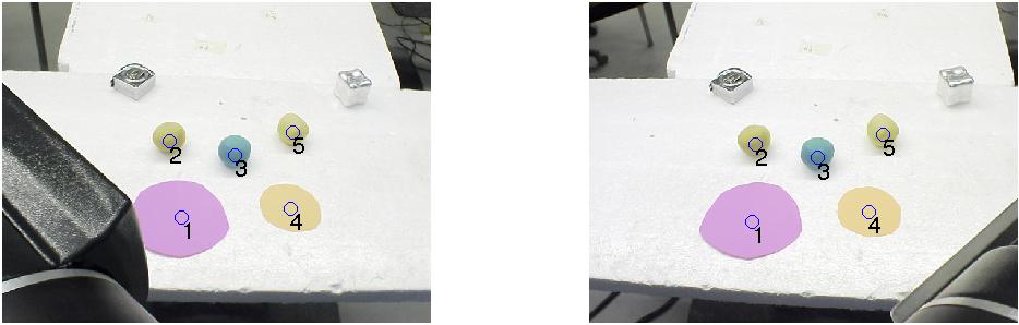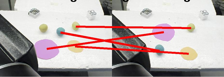 A new plan is generated by first assigning roles for each of the new objects in the already-acquired plan. Role assignment is accomplished by comparing object properties across the two images (using color and size). The assignment for this case is shown in the following figure (new configuration is on the left; the original configuration is on the right).