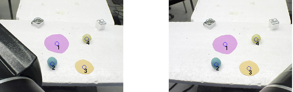 Now we present the robot with a novel configuration of objects. Note the distractor object in the upper-right of both images.