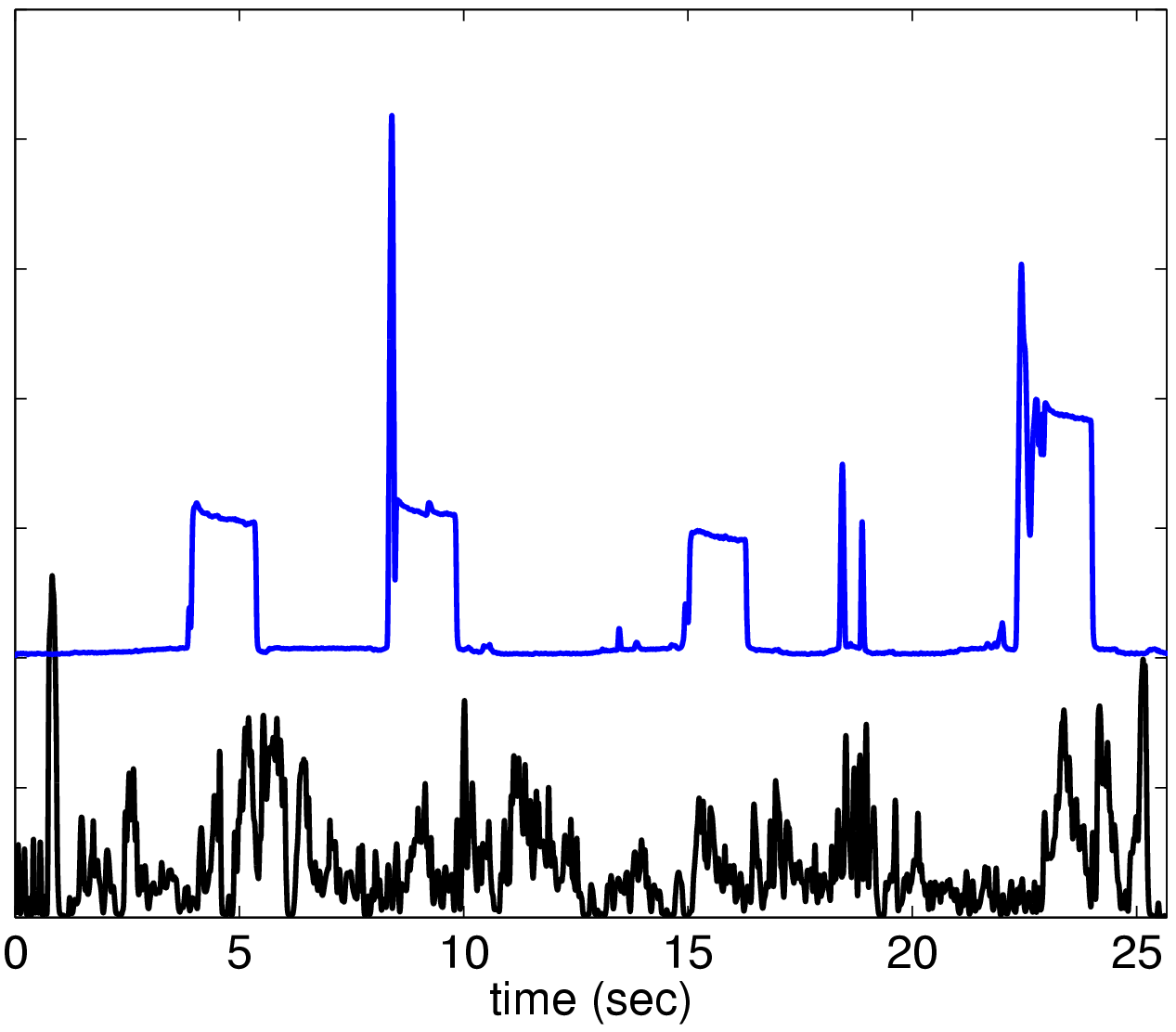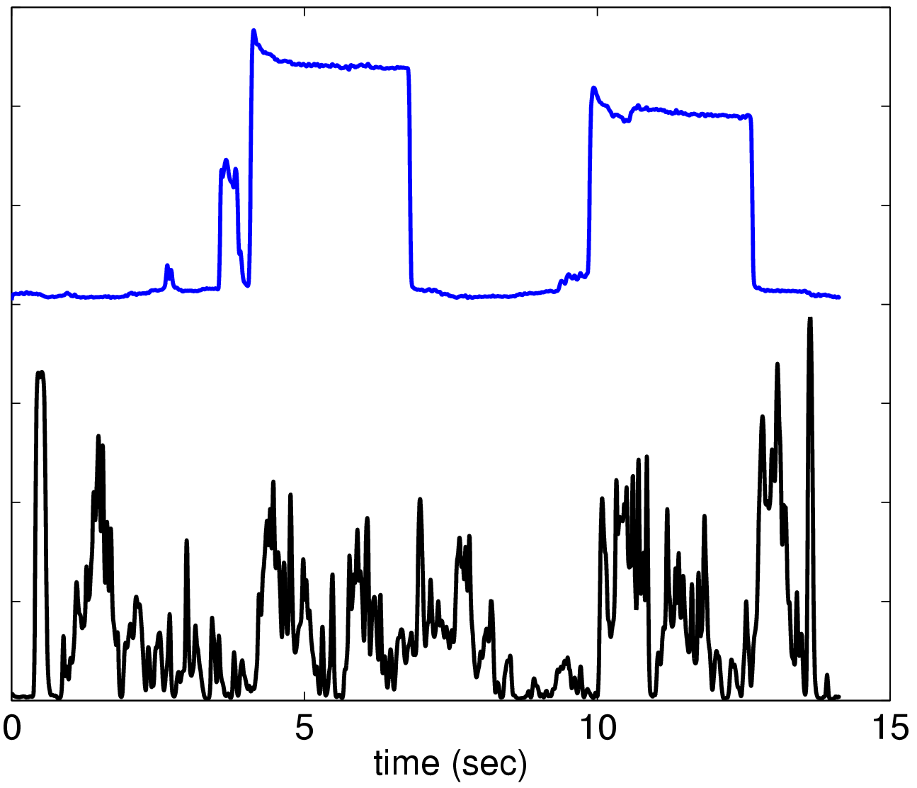 The magnitude of the finger force vector (blue) and the joint velocity vector (black) are shown below. Note the user's movements are far from smooth, but that the pick-up and drop actions are salient in the finger force data stream.